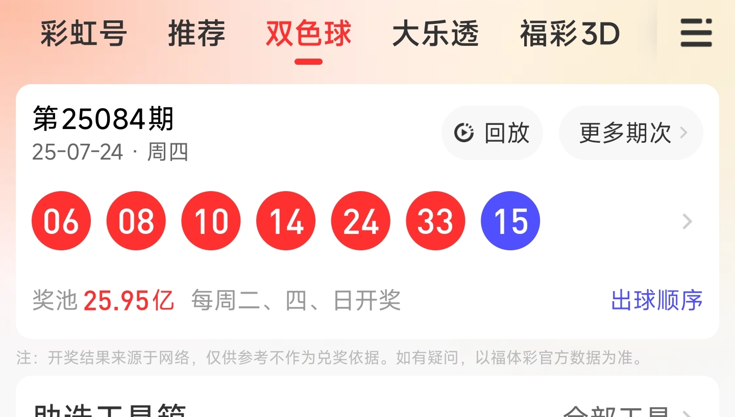 红球开出06,08,10,14,24,33。蓝球开出15。