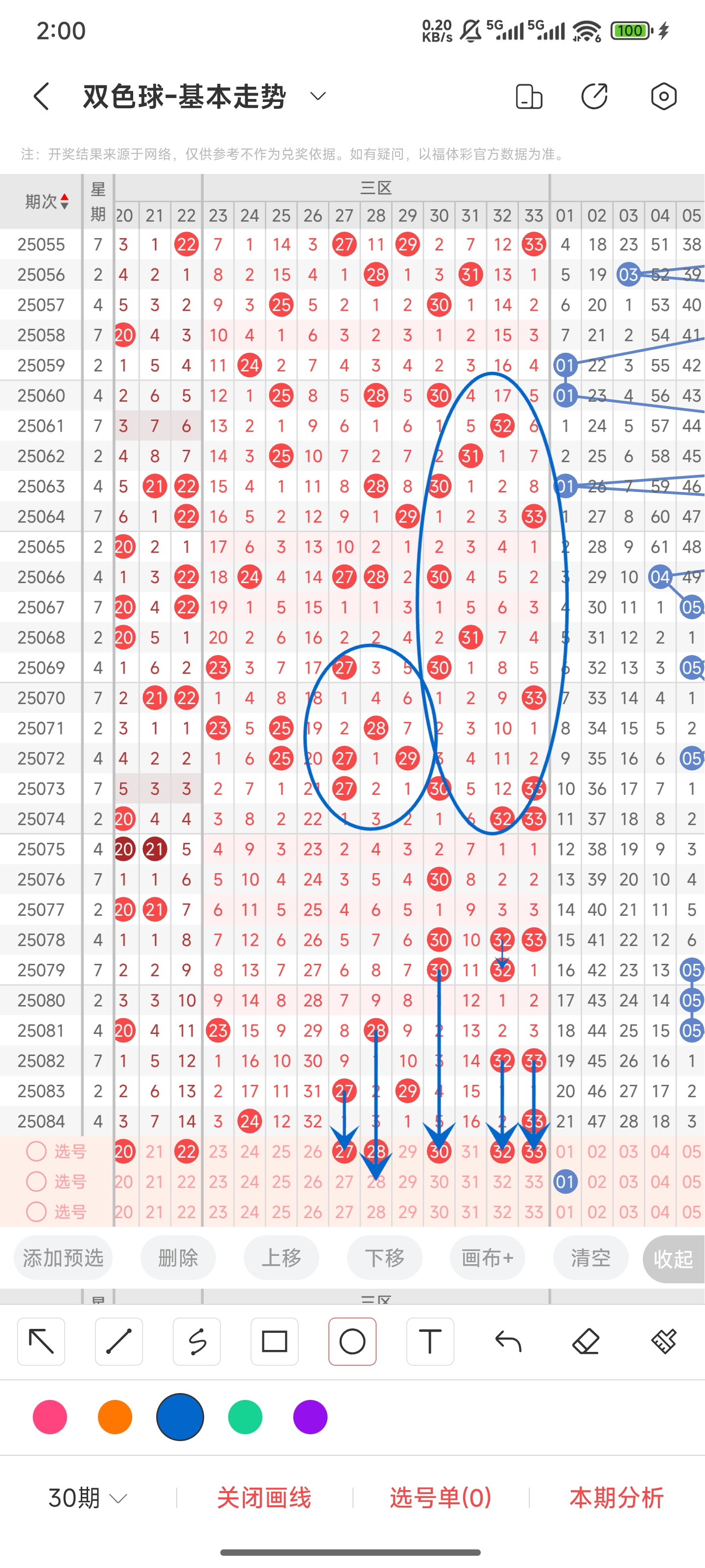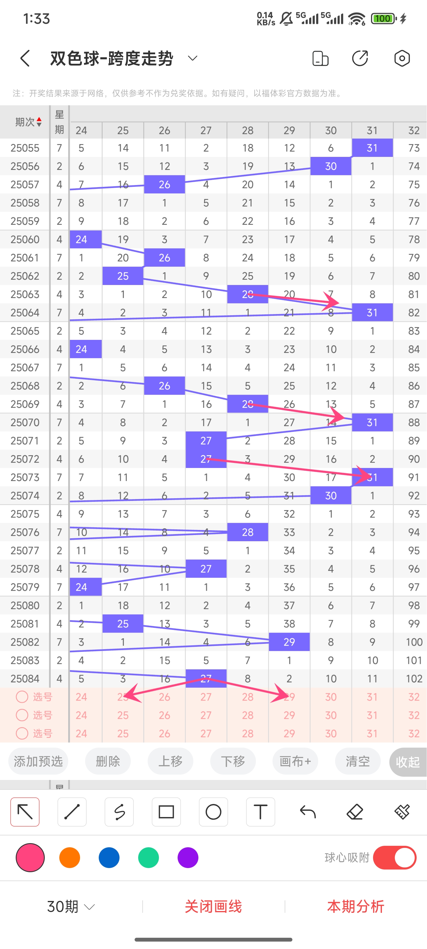 上一期三区开出24和33。往前一期开出的是27和29。24号是冷号回归,33号则是热号。33号可以考虑一手连出。通过分析三区走势图,最近十期内有开出数字的只有两期有开出冷号,其余的都是只开热门号码。因为上期有开冷门号码,那么本期我们着重关注热号就好了,可以关注27,28,30,32,33。所以本期我们推测有可能开出27,28,30,32,33等号码。