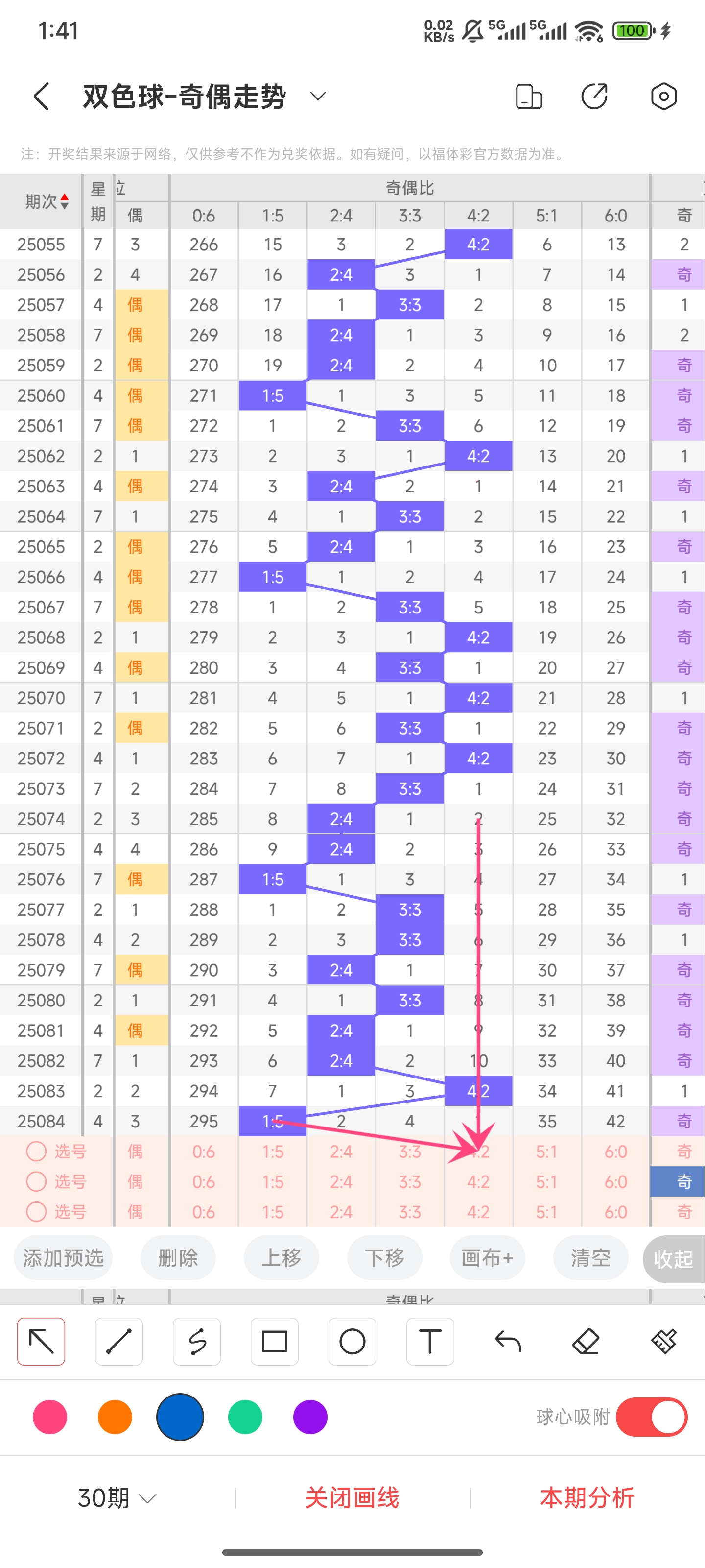 上期奇偶比为1:5,分别为偶偶偶偶偶奇。往前一期奇偶比为4:2。通过近30期内奇偶走势的数据分析,目前1:5奇偶比开出的概率是13.33%,2:4奇偶比开出的概率是33.33%,3:3奇偶比开出的概率是33.33%,4:2奇偶比开出的概率是20%,其余类型为0%。从概率上看2:4奇偶比和3:3奇偶比更容易开出,但从理论上2:4奇偶比和4:2奇偶比开出的几率应该是一样的。那么本期有可能会开出4:2奇偶比来回补概率差。