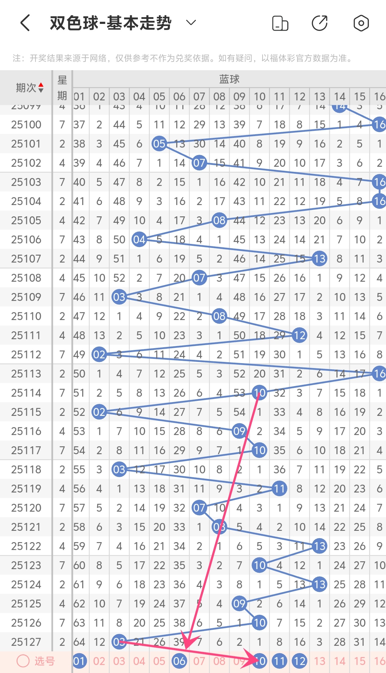 上期蓝球开出03,本期我们可以从上面走势图中看到选号的思路,06为斜连走势,10为隔期回补走势,综合以上分析本期蓝球推荐01 06 10 11 12