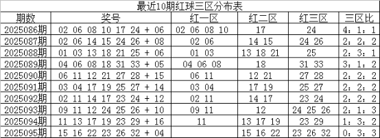 一区上期走冷断区,近10期开出20个红球,走势与理论相当,本期看好转热,开出3个号码,参考号码02、04、06;二区上期表现较热,出现3个奖号,近10期共开出20个红球,出号比例与理论持平,本期预计继续走温,出现1-2个红球,注意号码12、19;三区上期表现较热,出现3个奖号,近10期共开出20个红球,出号与理论个数持平,本期预计继续走温,出现1-2个红球,看好号码28;