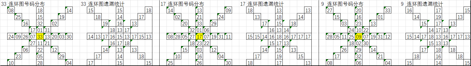 由于数据量大,不一一统计,下图为各个号码分别在33、17、9连环图上的遗漏统计汇总图: