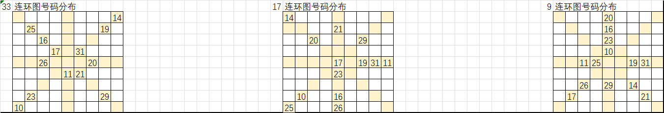 以上是遗漏大于16的号码分别在33、17、9连环图的分布,按照九转连环图选号规律,选取这些号码“环上”和“轴上”的相邻号码作为胆码,把这些胆码进行次数统计即可形成我们组号的排序,从出次多到少进行取号得出我们的大底。
