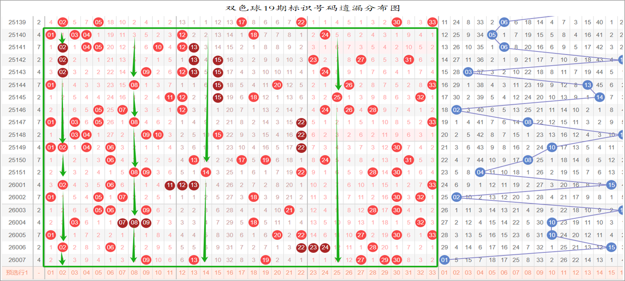 以上是33、17、9的连环图,可以在一起彩平台的九转连环图中查看历期号码分布,以当前期数来看,我们以19期号码来进行遗漏统计,然后把每个号码在近19期的遗漏总数统计出来,分别带入33、17、9的连环图,取出遗漏值大于16的号码,把这些号码在“环上”和“轴上”的相邻号码取出来进行统计,选取出次前15的号码作为大底。