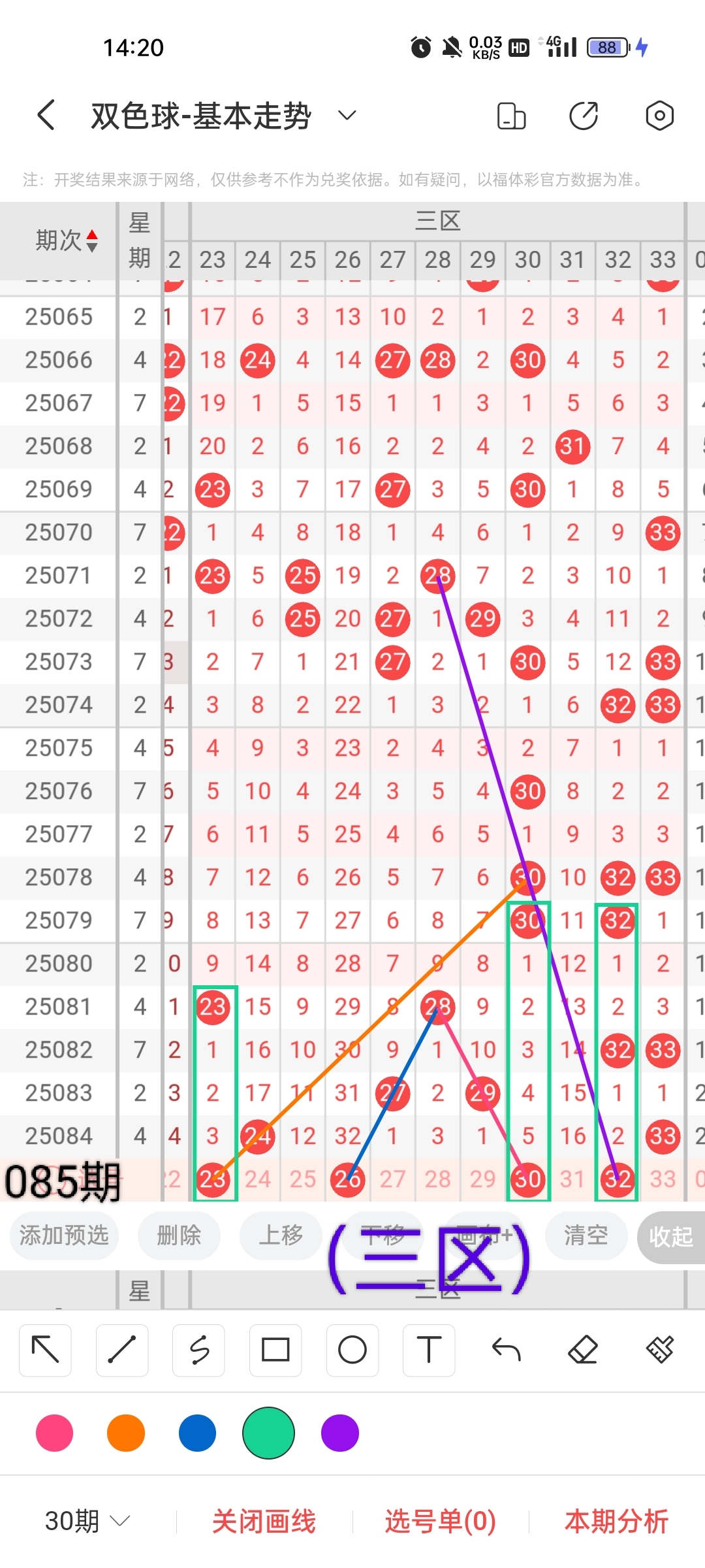 小梁根据图中画线思路,最后给大家汇总提供一下本期红球、蓝球数据,供大家参考: