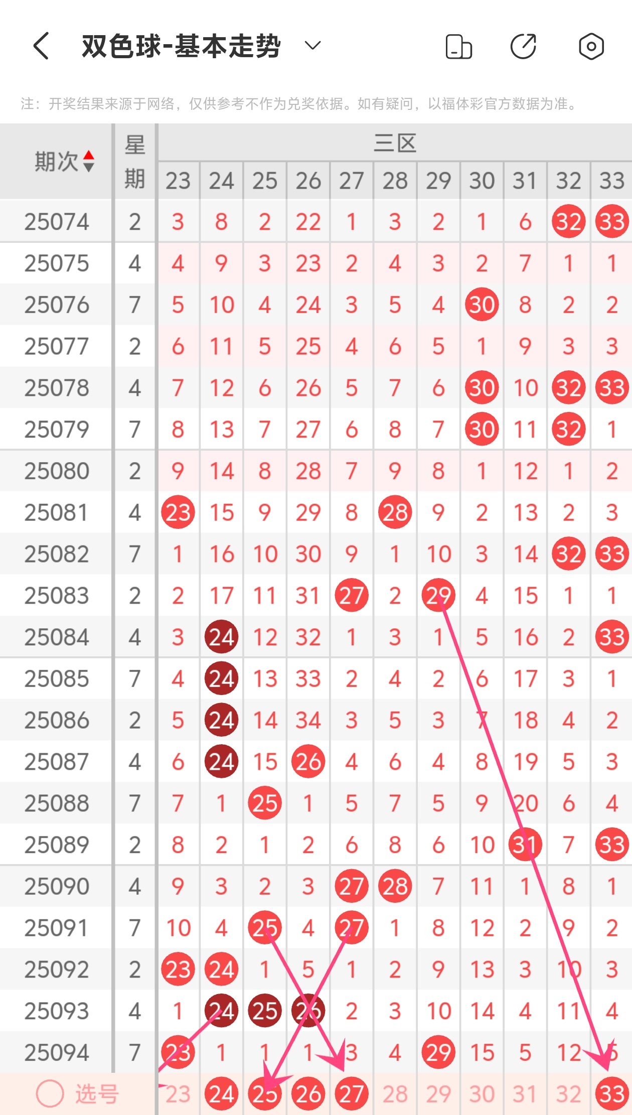 上期第三区间开出23 29,本期我们可以从上面走势图中看到选号的思路,25为斜连走势,27为斜连走势,33为斜连走势,综合以上分析本期第三区间推荐24 25 26 27 33