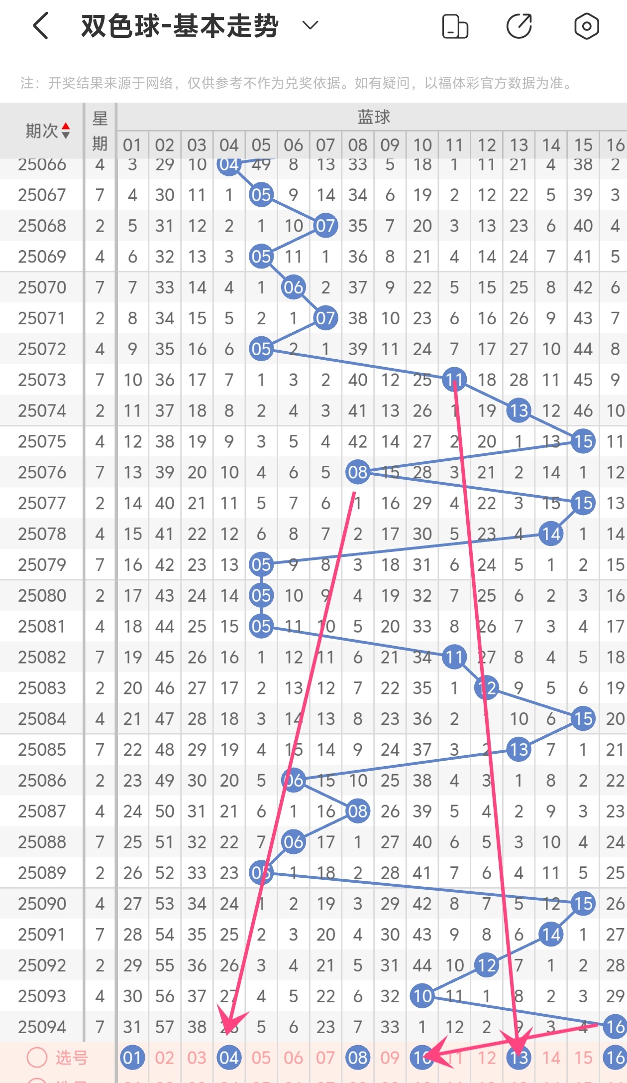上期蓝球开出16,本期我们可以从上面走势图中看到选号的思路,04为斜连走势,10隔期回补走势,13为斜连走势,综合以上分析本期蓝球推荐01 04 08 10 13