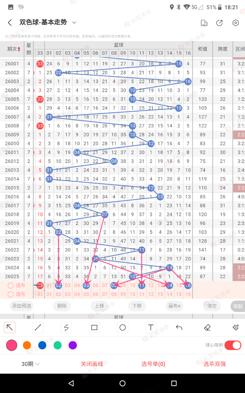 通过以上规律,近期表现为近10年同期,开球多的路数可以不考虑,(008-009-010-011-013-014-016-018-020-024期开球多的,路数错,)直到错为止因此026期不看0路蓝色,但本期防错