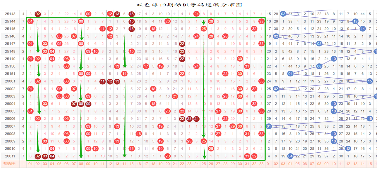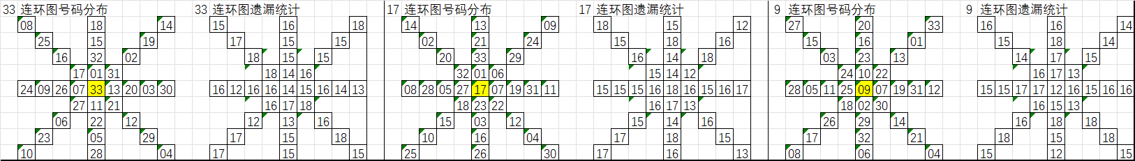由于数据量大,不一一统计,下图为各个号码分别在33、17、9连环图上的遗漏统计汇总图: