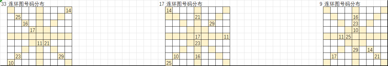 以上是遗漏大于16的号码分别在33、17、9连环图的分布,按照九转连环图选号规律,选取这些号码“环上”和“轴上”的相邻号码作为胆码,把这些胆码进行次数统计即可形成我们组号的排序,从出次多到少进行取号得出我们的大底。