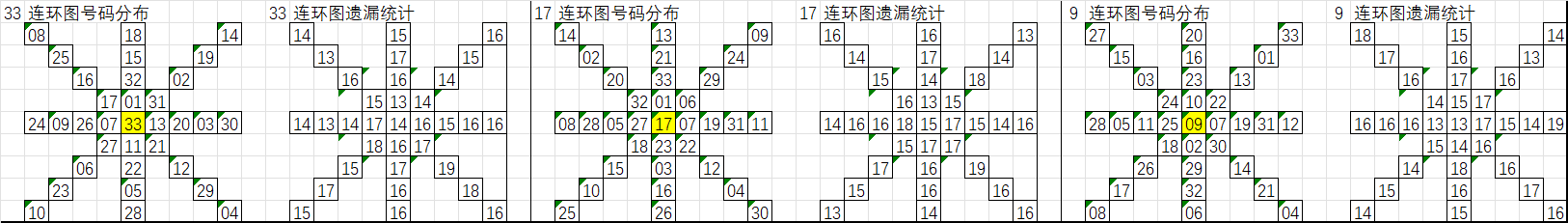 由于数据量大,不一一统计,下图为各个号码分别在33、17、9连环图上的遗漏统计汇总图: