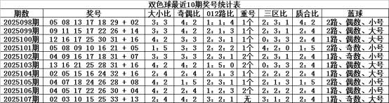 上期奇偶比为4:2,奇数活跃,近10期奇偶比为3030,奇偶红球持平,其中奇数红球热4期,平衡3期,走冷3期,本期预计奇数逐渐热出,关注奇偶比5:1