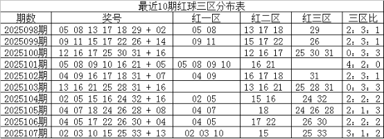 一区上期走热,开出3个红球,近10期开出19个红球,走势与理论相当,本期预计再次走温,出现1-2个奖号,参考号码05;二区上期走温,开出1个红球,近10期共开出23个红球,出号比例相对较高,本期看好再次热出,关注3个红球,注意号码131415;三区上期走温,开出2个红球,近10期共开出18个红球,出号与理论个数持平,本期预计继续走温,出现1-2个红球,看好号码2931