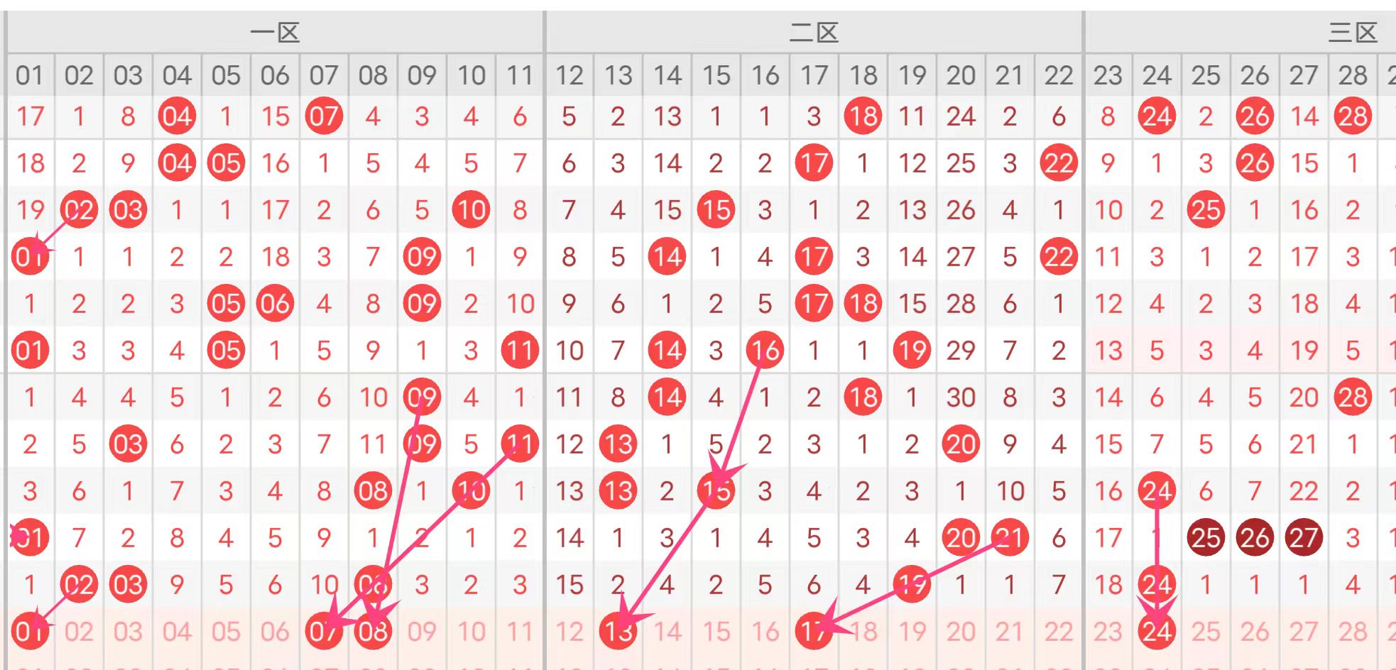红球三区比:本期红球三区比为 3:1:2,近五期红球区间比分别为 1:2:3,3:21 ,2:2:2 ,1:2:3,3:1:2 本期预计红球三区比为 2:2:2。