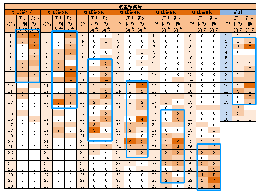 蓝球,历史同期频次最多的为11;近30期,频次最多的为3-10,明显特征是01路优势;推荐重点3-7-8-9-10-12-13。