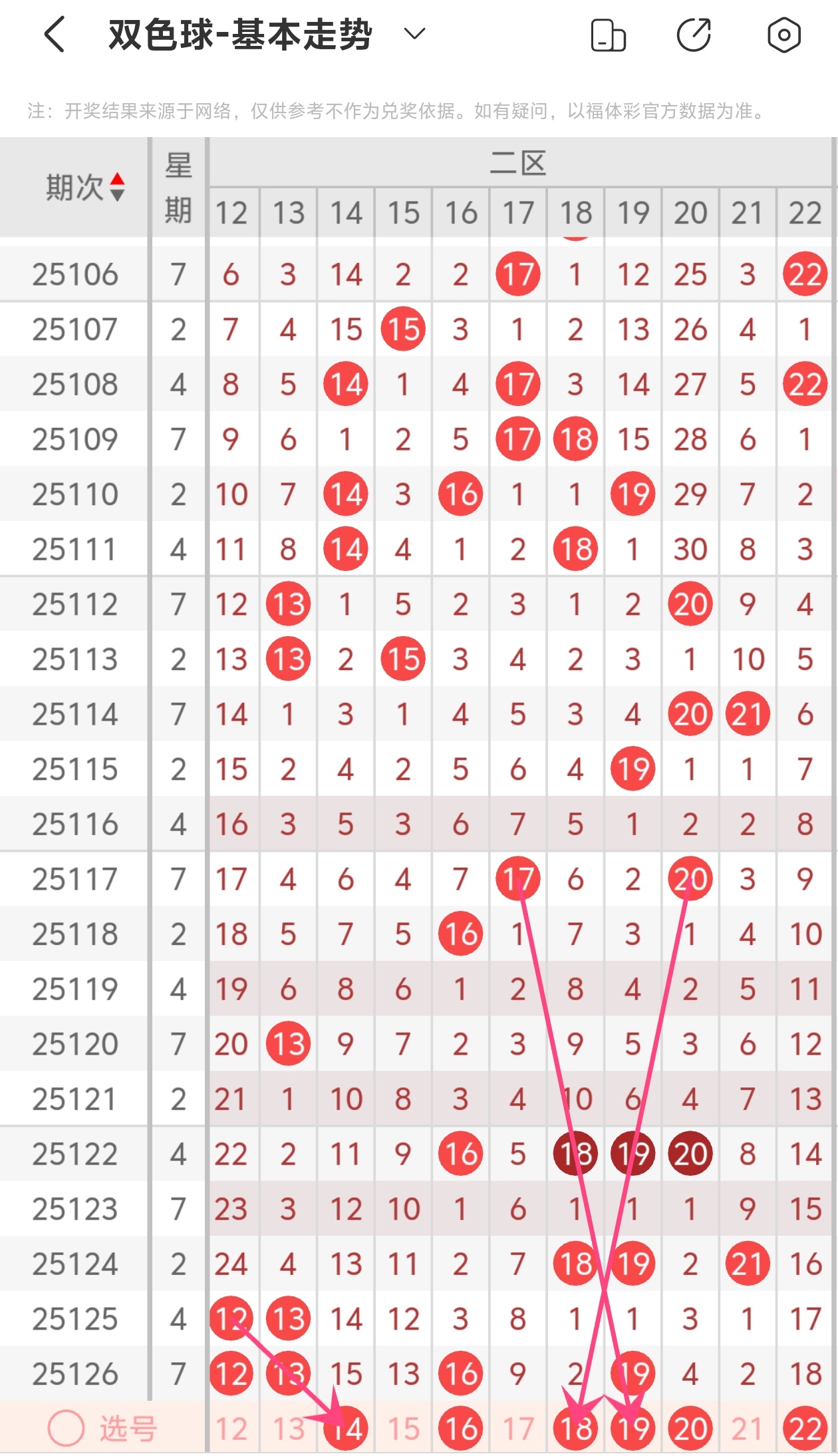 上期第二区间开出12 13 16 19,本期我们可以从上面走势图中看到选号的思路,14为斜三连走势,16为重码,18为斜连走势,19为斜连走势,综合以上分析本期第二区间推荐14 16 18 19 20 22