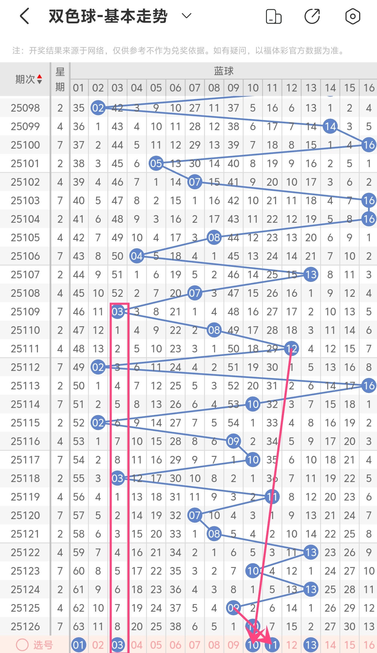 上期蓝球开出10,本期我们可以从上面走势图中看到选号的思路,03为斜连走势,10为重码带斜连走势,11为斜连走势,综合以上分析本期蓝球推荐01 03 10 11 13