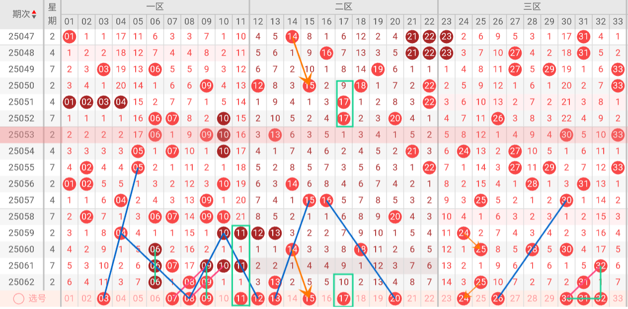 根据以上特点,我们对双色球第25063期进行如下分析: