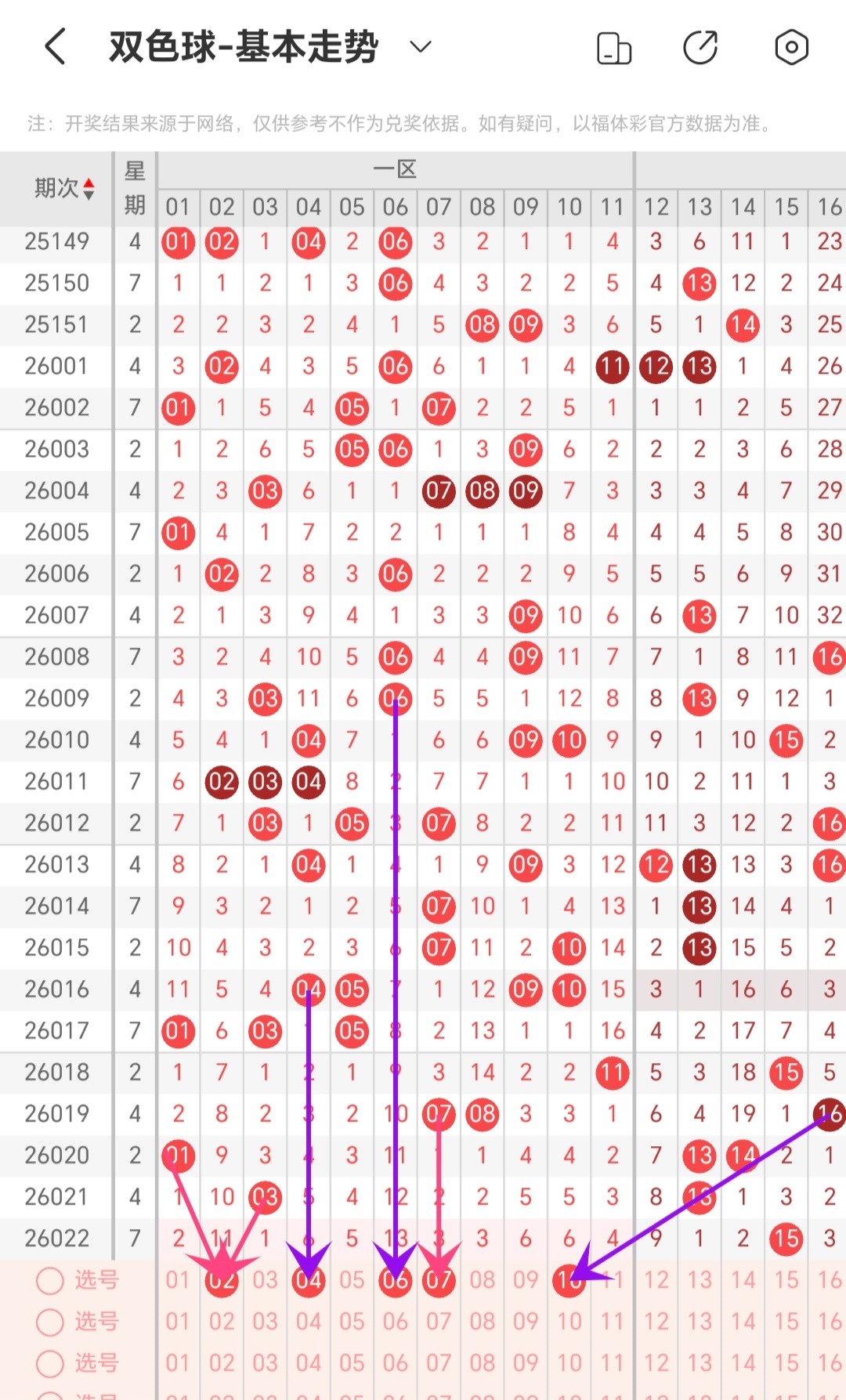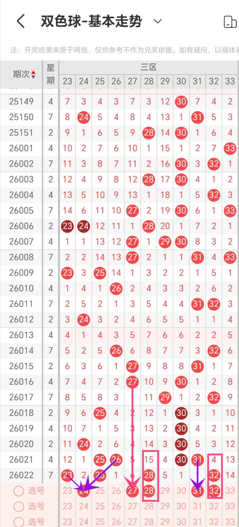 通过对同星期周二重号出现数量规律进行统计分析,本期考虑出号0-1个,即01-13-14-21-24-30出号0-1个