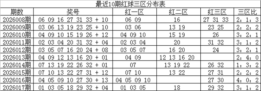 一区上期走热,开出3个红球,近10期开出25个红球,表现非常活跃,本期预计走温,开出1-2个红球,参考号码02、07;二区上期走温,开出1个红球,近10期共开出18个红球,出号比例与理论持平,本期预计继续走温,出现1-2个红球,注意号码15、19;三区上期走温,开出2个红球,近10期共开出17个红球,走势相对较冷,本期预计继续温冷,看好号码24、27;