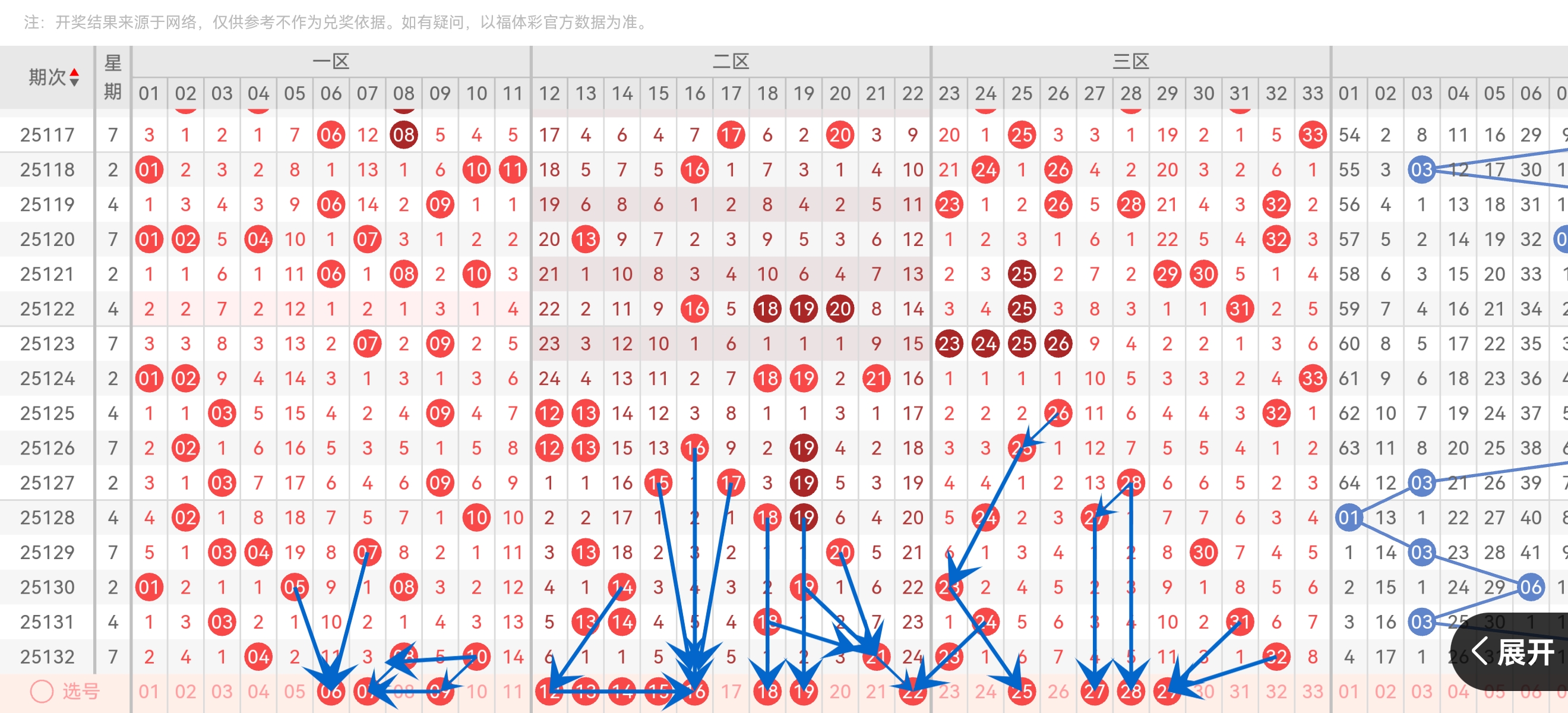 一区(01-11)出 3码(04、08、10) ,二区(12-22)出 1码(21) ,三区(23-33)出 2码(23、32) 。