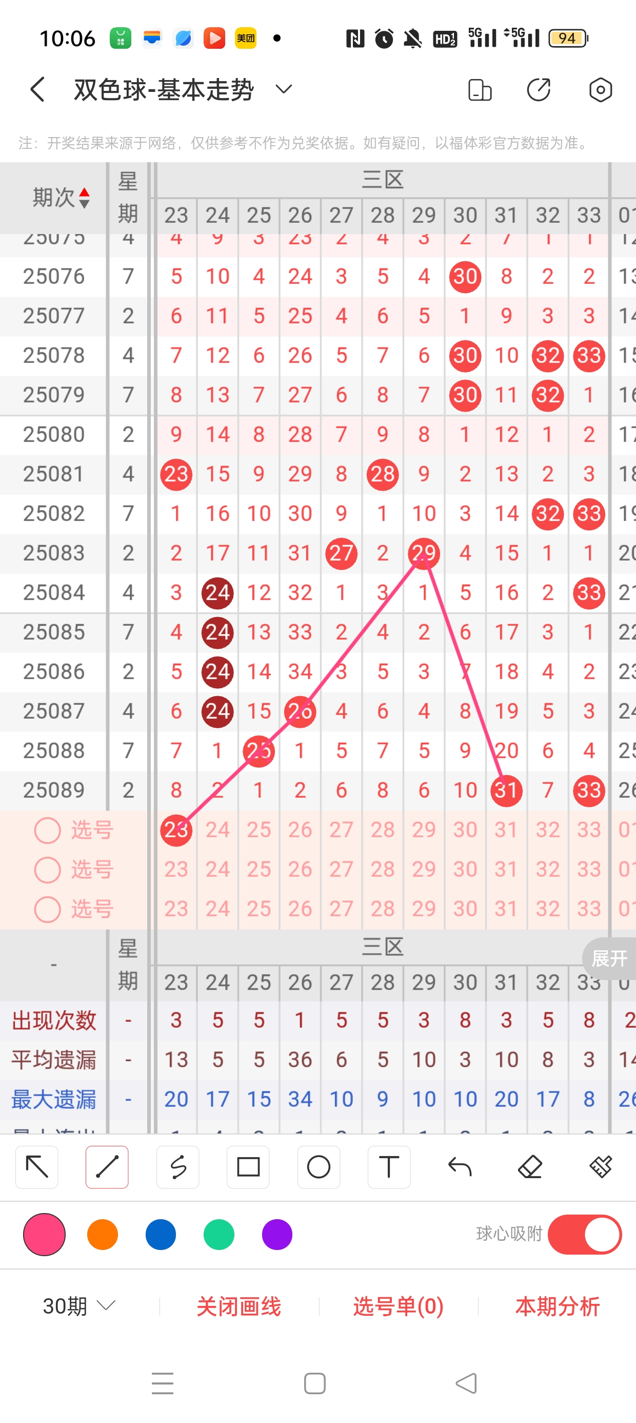 三区(23-33)近87期本区邻孤传39邻73孤6传,孤号热度高,本期着重邻传。近87期本区012路45:36:43,0/2路热度高,本着重1路。23已遗漏8期,与25之间呈现向左遗漏递减态势,需防。