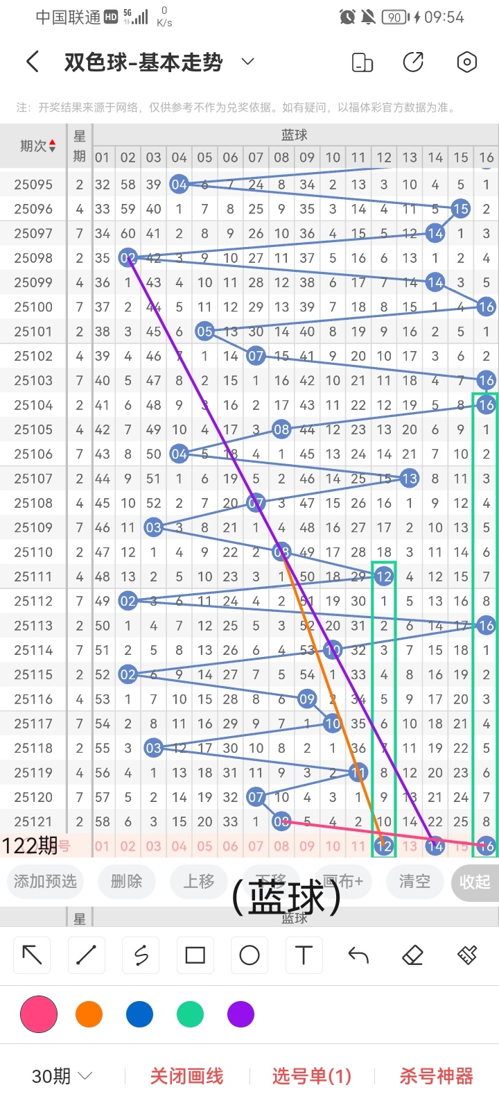 小梁根据图中画线思路,最后给大家汇总提供一下本期红球、蓝球数据,供大家参考: