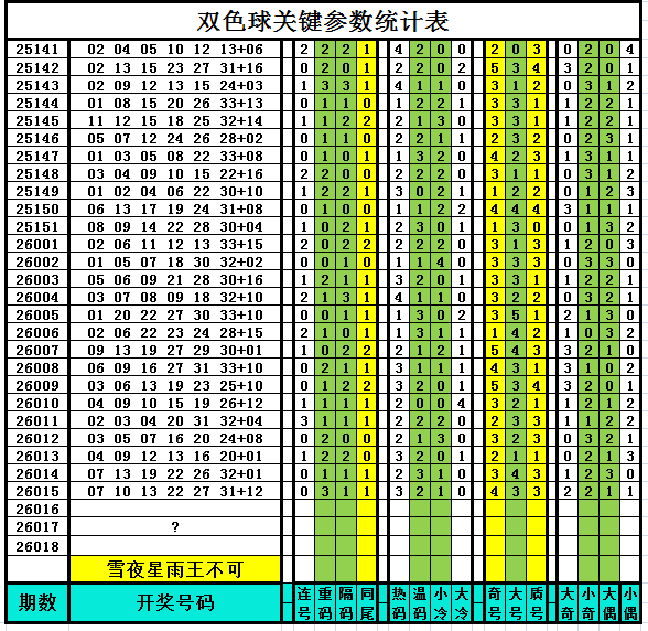 以下是作者手工统计的双色球关键参数统计表,对喜欢参数分析、过滤缩水、选号胆杀的技术性双色球爱好者有所帮助,其它读者可略过不看。