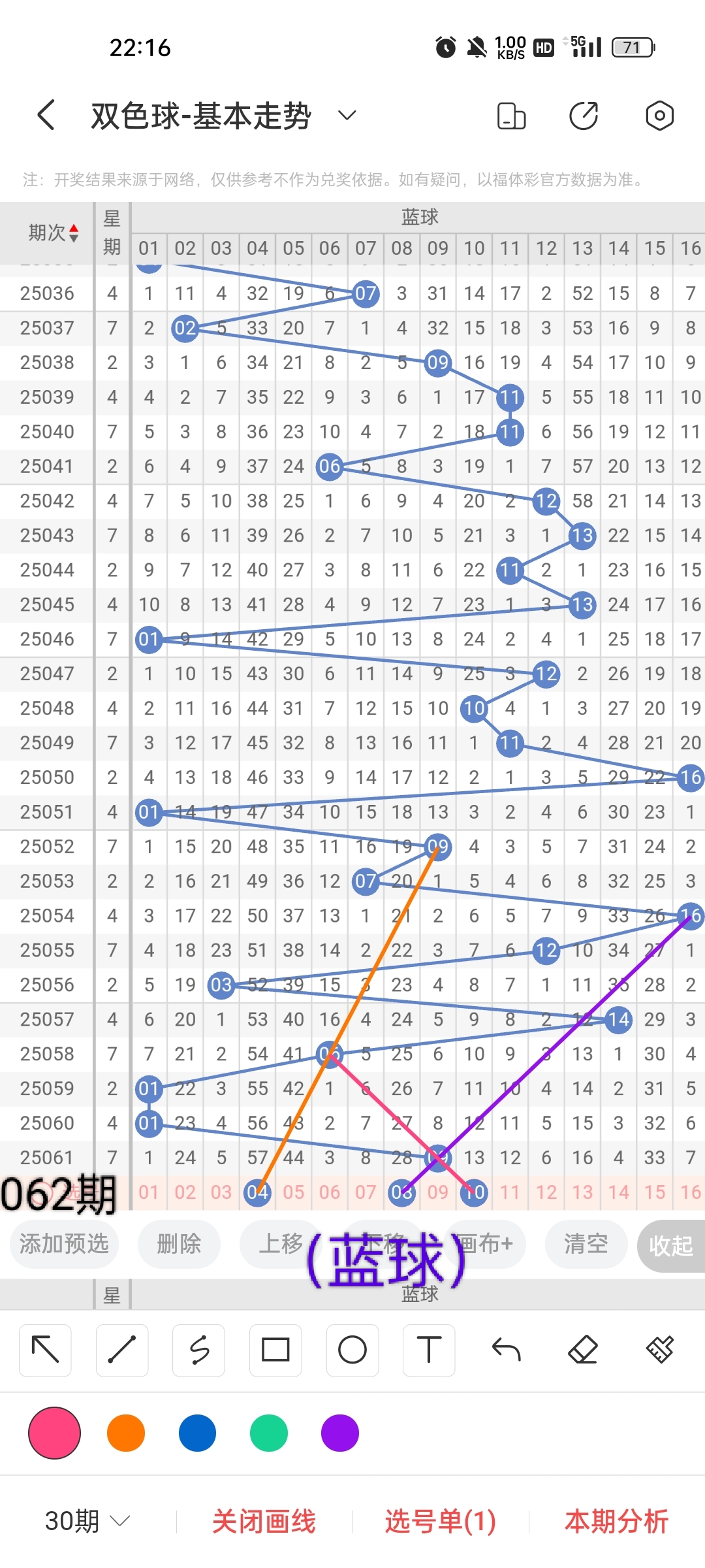 小梁根据图中画线思路,最后给大家汇总提供一下本期红球、蓝球数据,供大家参考: