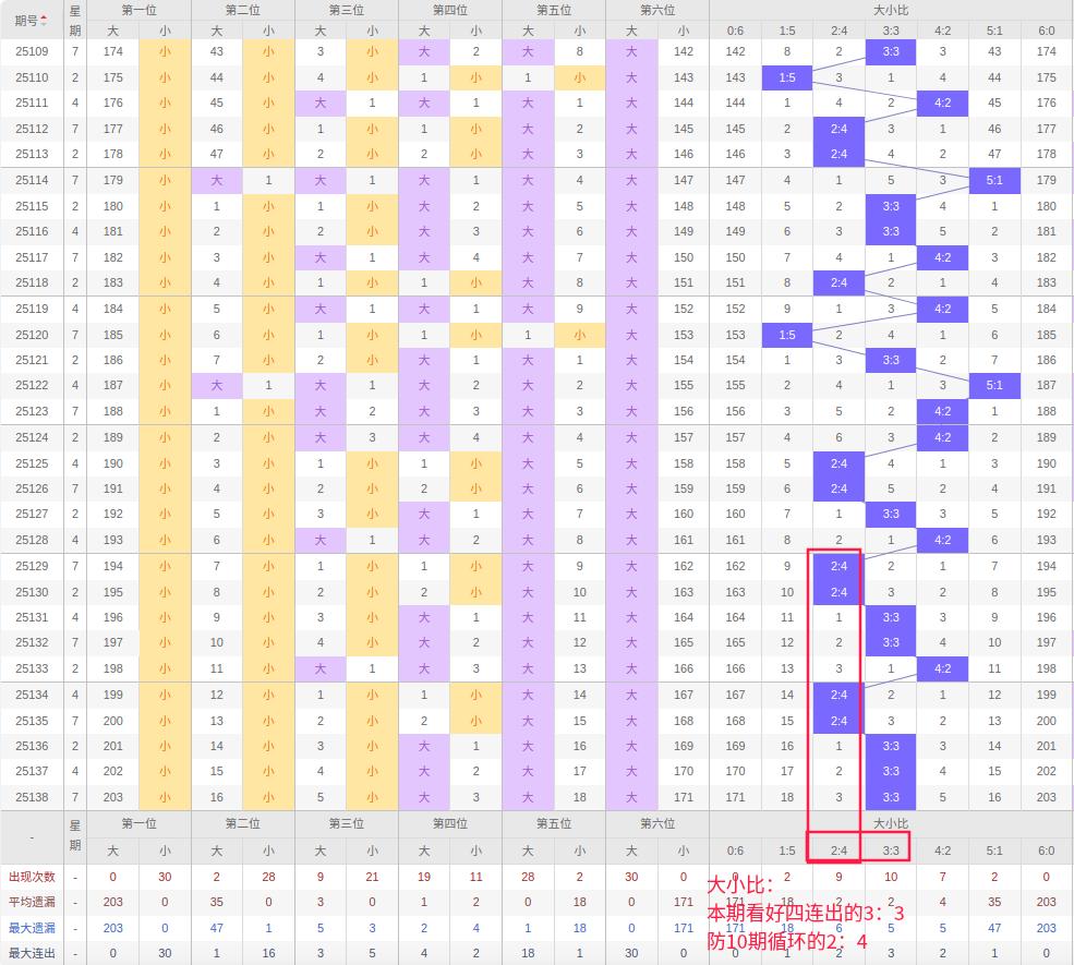 上期大小比:3:3,近10期大小比出现情况:4:2、2:4、2:4、3:3、3:3、4:2、2:4、2:4、3:3、3:3、3:3,最近10期出现5期3:3,出现1期4:2,出4期2:4,出现0期5:1,出现0期1:5,出现0期6:0,出现0期0:6,根据近10期规律本期看好四连出3:3,防10期循环出2:4,综上所述推荐大小比推荐:2:4,重点关注:3:3。