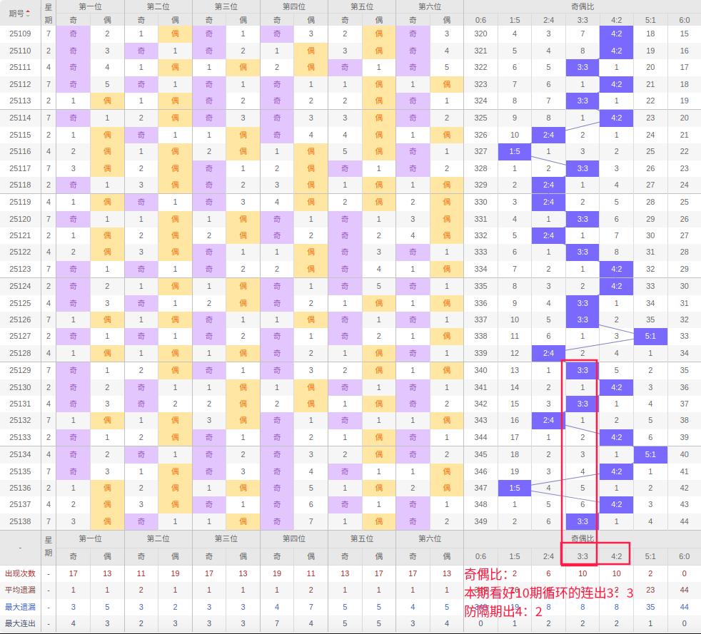 上期奇偶比:3:3,近10期奇偶比出现情况:3:3、4:2、3:3、2:4、4:2、5:1、4:2、1:5、4:2、3:3,最近10期出现3期3:3,出现4期4:2,出现1期2:4,出现1期5:1,出现1期1:5,出现0期6:0,出现0期0:6,根据近10期规律本期看好10期循环的3:3,防隔期出4:2,综上所述推荐奇偶比推荐:4:2,重点关注:3:3。