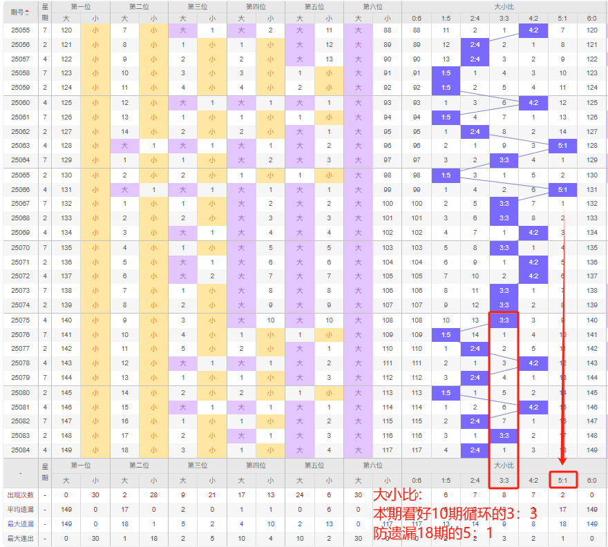 上期大小比:2:4,近10期大小比出现情况:3:3、1:5、2:4、4:2、2:4、1:5、4:2、2:4、3:3、2:4,最近10期出现1期3:3,出现3期4:2,出4期2:4,出现0期5:1,出现2期1:5,出现0期6:0,出现0期0:6,根据近10期规律本期看好10期循环的3:3,防遗漏18期的5:1,综上所述推荐大小比推荐:5:1,重点关注:3:3。