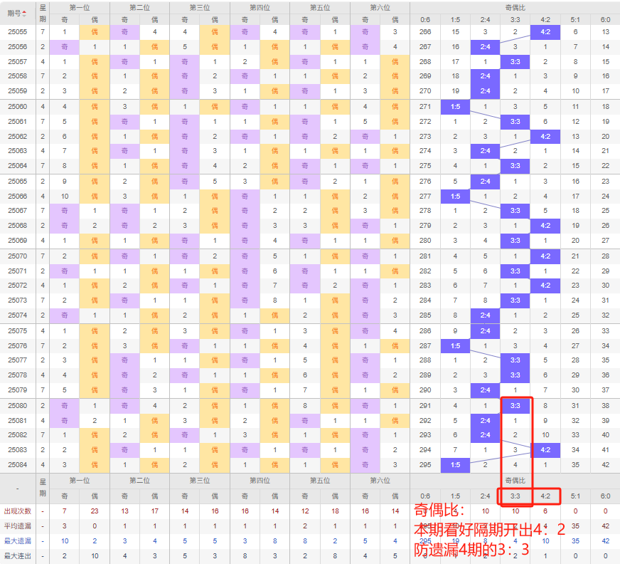 上期奇偶比:1:5,近10期奇偶比出现情况:2:4、1:5、3:3、3:3、2:4、3:3、2:4、2:4、4:2、1:5、,最近10期出现4期3:3,出现1期4:2,出现4期2:4,出现0期5:1,出现2期1:5,出现0期6:0,出现0期0:6,根据近10期规律本期看好隔期开出4:2,防遗漏4期的3:3,综上所述推荐奇偶比推荐:3:3,重点关注:4:2。