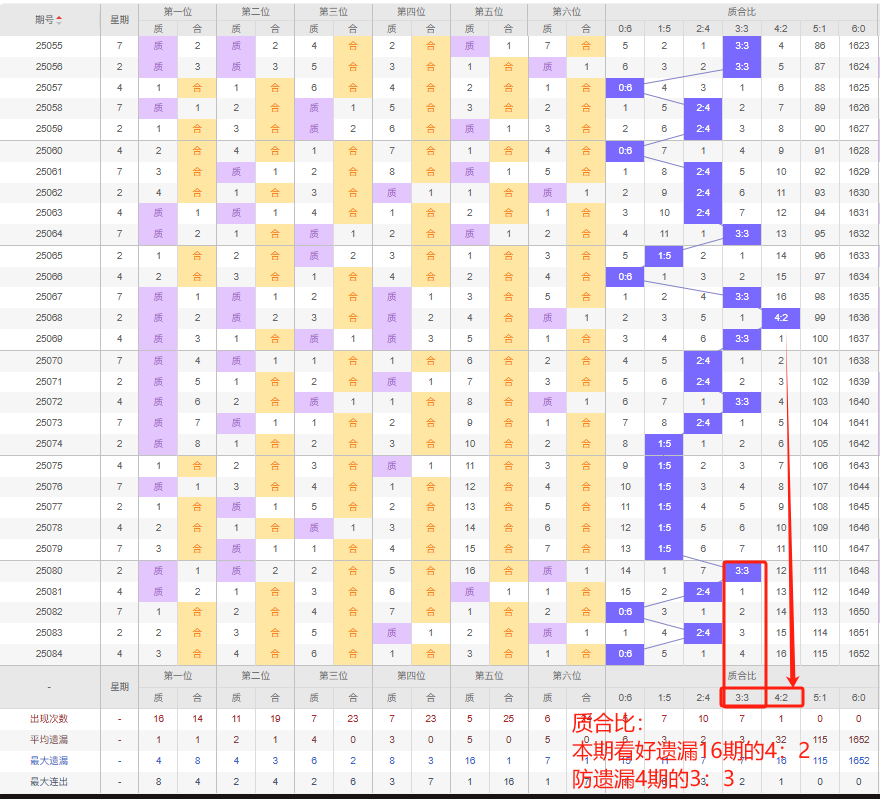 上期质合比:0:6,近10期质合比出现情况:1:5、1:5、1:5、1:5、1:5、3:3、2:4、0:6、2:4、0:6,最近10期出1期3:3,出现0期4:2,出现2期2:4,出现0期5:1,出现5期1:5,出现0期6:0,出现2期0:6,根据近10期规律本期看好遗漏16期的4:2,防遗漏4期的3:3,综上所述推荐质合比推荐:3:3,重点关注:4:2。