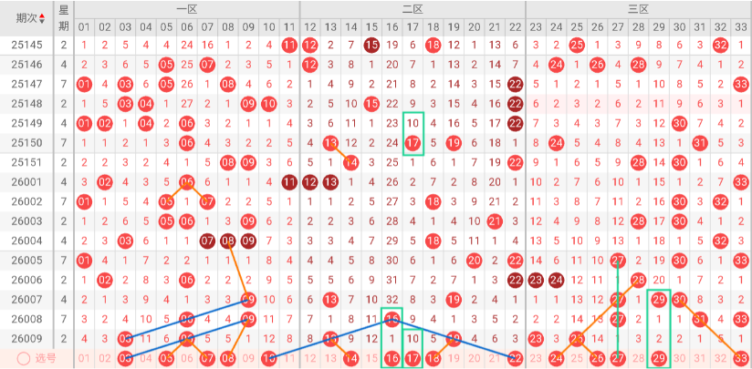 第三区间(23-33):三区上期开出号码 23 25,近5期出号量3-3-3-3-2。本期三连号趋势:32,隔码斜连趋势:24 28。近5期平均出2.8枚,平均出号增加。