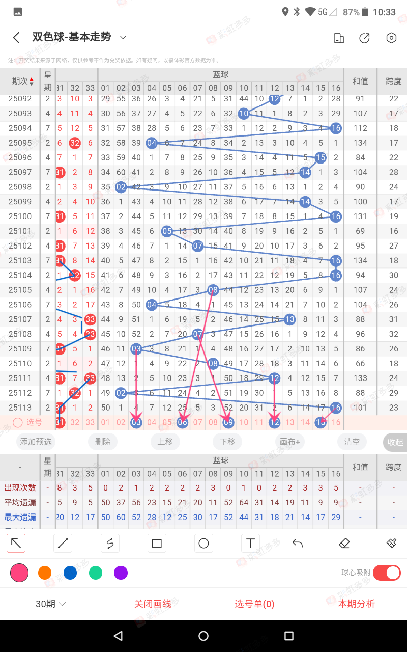 比如,113期蓝16号,112期蓝2号(属2路)那我们这期要杀的蓝号就是16+2=18大16减16,02为本期杀号,008期错,039期-040期,060,074-075期100错,防三连错