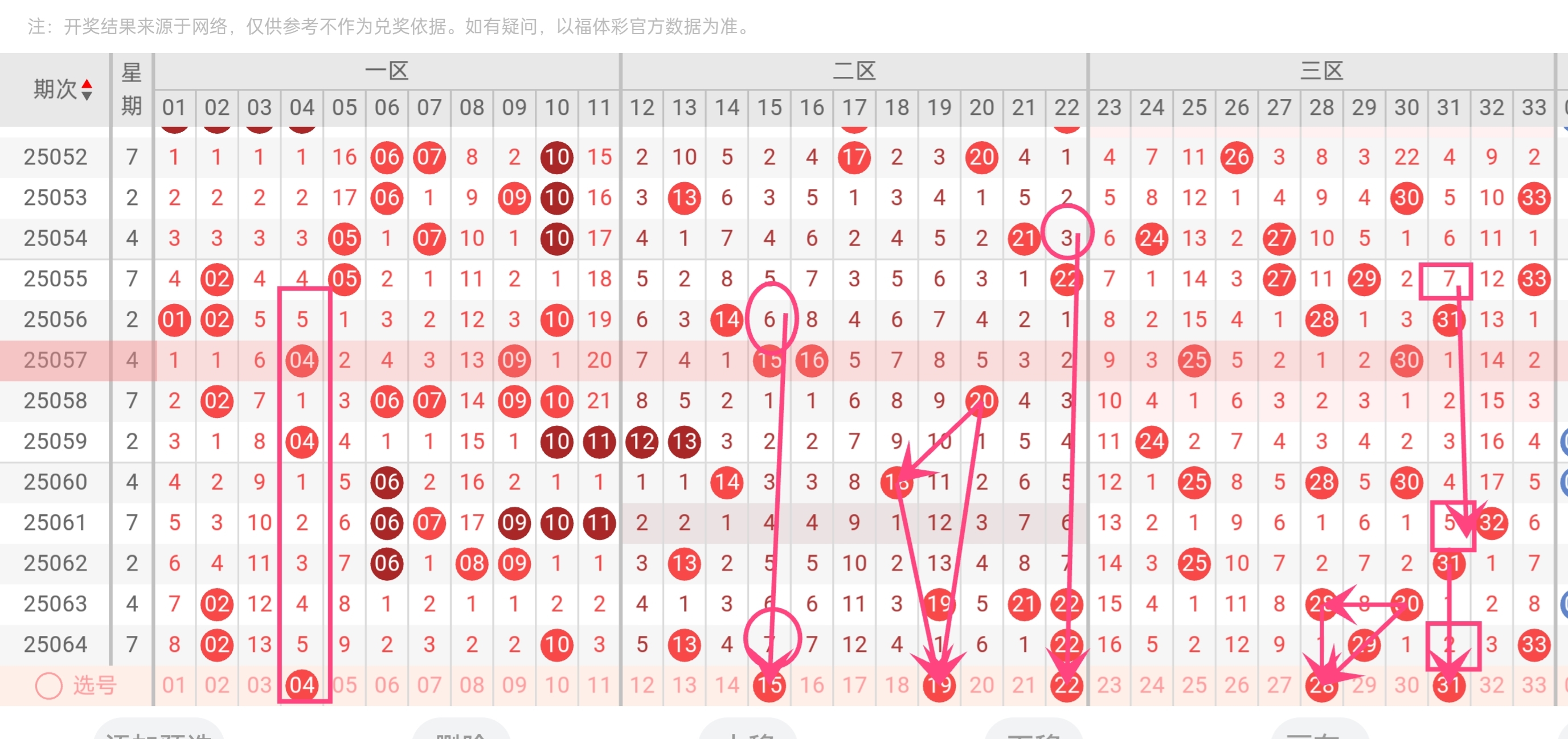 - 当期开出但近20期仅4次出现,大号区(23-33)冷号压缩率91%
