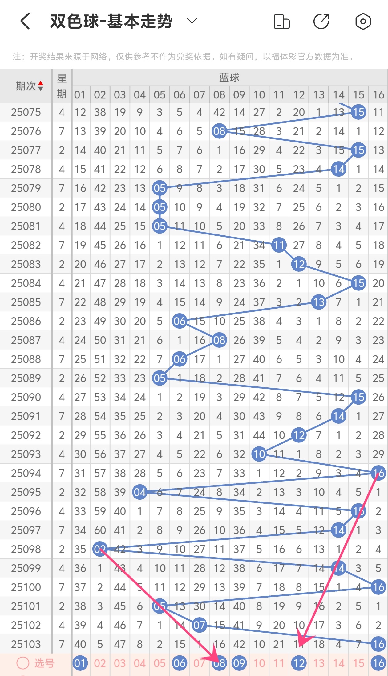 上期蓝球开出16,本期我们可以从上面走势图中看到选号的思路,08为斜连走势,12为斜连走势,综合以上分析本期蓝球推荐01 08 09 12 16