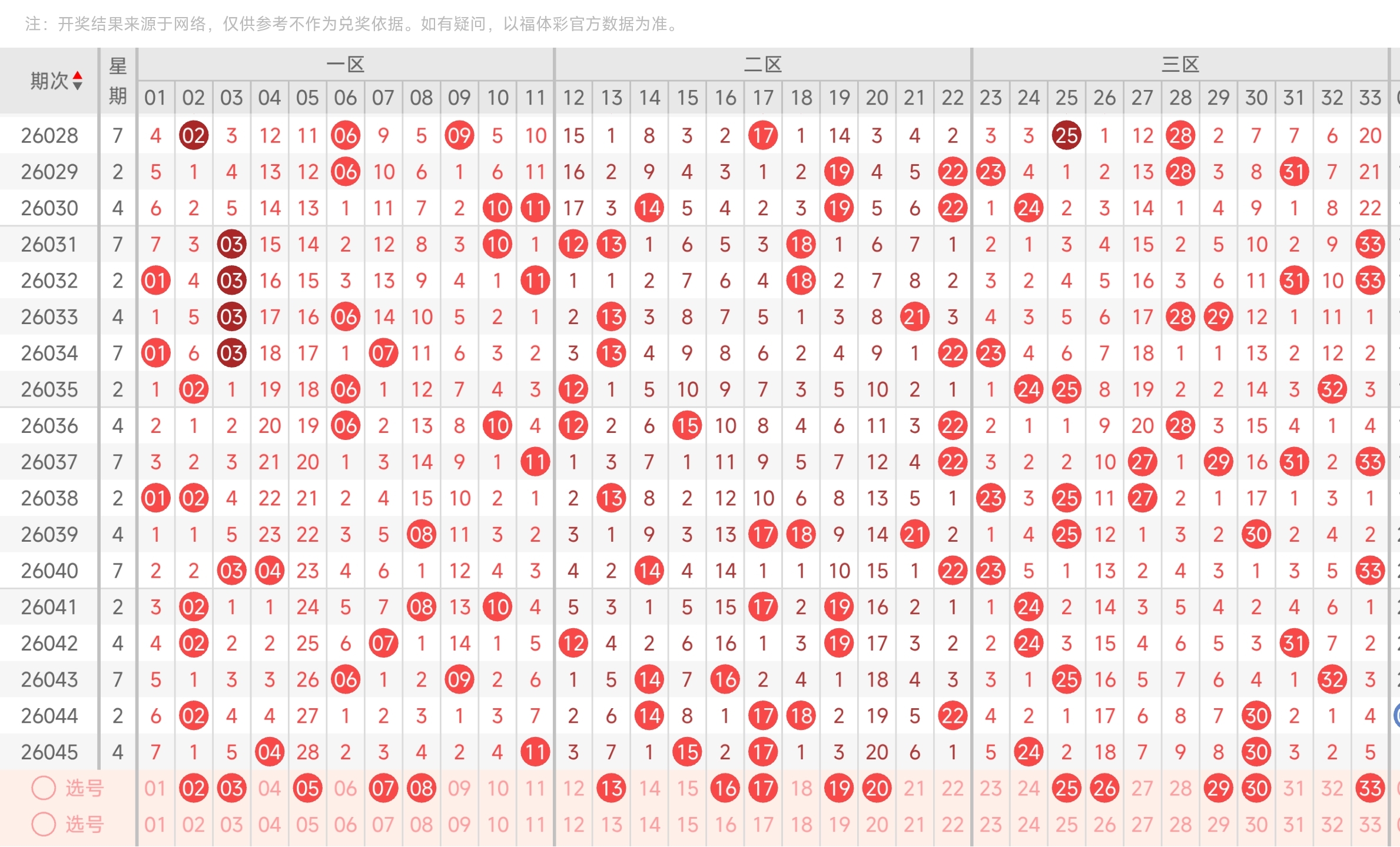 红球推荐:2,3,5,7,8,13,16,17,19,20,25,26,29,30,33。