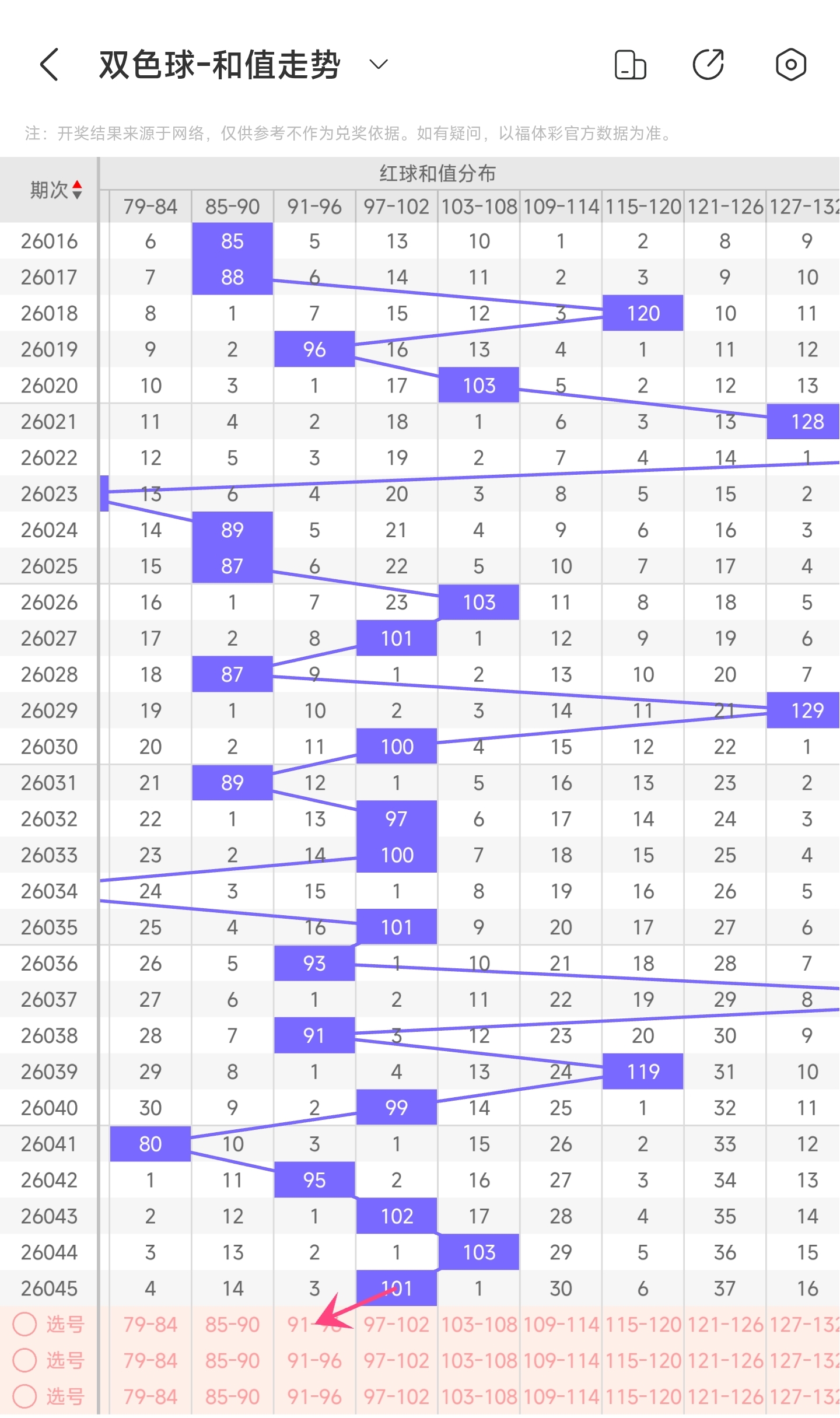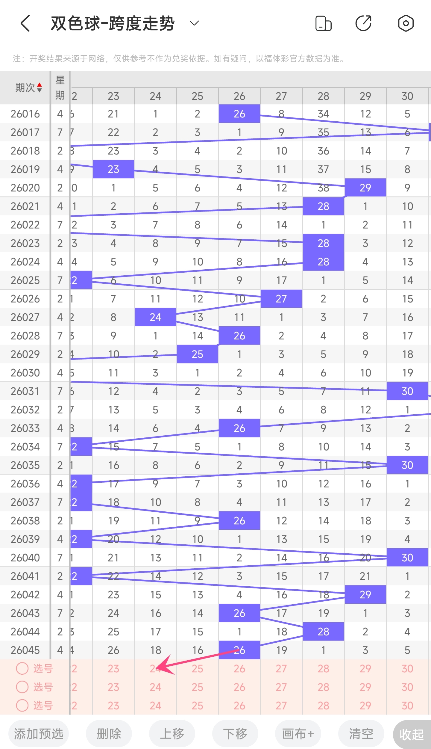 上期龙头为4,凤尾为30,跨度为26,往前一期跨度是28,偏移量为2。26跨度值是30期内开出比较大的跨度值。上升的空间比较小,下降空间比较大,根据最近龙头凤尾走势,推测本期跨度可能会变小一点,所以推测本期跨度趋势是往左的,跨度变小,小概率跨度变大。