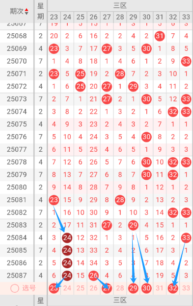 根据走势图可以看出当前区,078期开出了30.32.33三个号码球,079期开出了30.32二个号码球,080期没有开出号码球,081期开出了23.28二个号码球,082期开出了32.33二个号码球,083期开出了27.29二个号码球,084期开出来24.33二个号码球,085期开出了24一个号码球,086期开出了24一个号码球,087期开出24.26二个号码球 ,按照如此规律判断本期当前区可能开出1双1单。我们看下当前区上期开出24重叠号,那么本期当前区要定重叠号的情况下可关注26码球。再看下当前区上期没有开出斜连号,当期选号得留意27斜连号。本区重点关注23.27.29.30.32