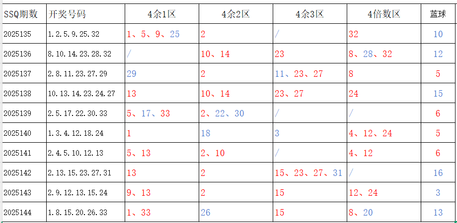 分享第一个数据分析:四分区统计数据。相对于传统的三分区,个人习惯使用四分区,就是把33个红球号码除以4,所得的余数分区如下: