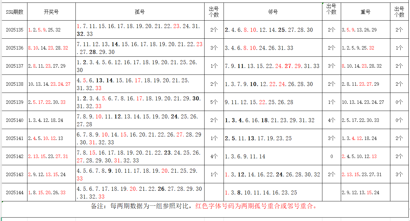 如图,以近两期数据为一组,进行对比分析。相同的孤号、邻号,可能在下期出1-4个左右。上期开出孤号3个,邻号2个,重号1个。本期参考孤号:3.4.5.6.10.11.12.13.17.18.22.23.24.28.29.30.31;邻号:2.7.9.14.16.19.21.25.27.32;孤、邻号重合号码精选:***(会员专区可见)。个人分析,仅供参考。