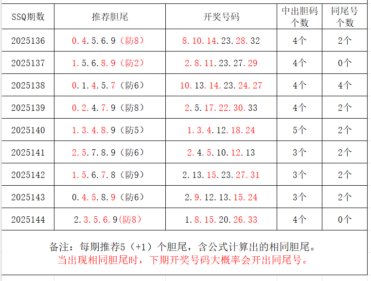 如图,每期推荐胆尾中出1-4个。上期推荐胆尾中出4尾4码!推荐胆尾是按照公式计算的顺序,不定位红球号码的顺序。本期推荐胆尾:9尾/8尾/0尾/1尾/7尾  。加推重点胆尾:***(会员专区可见)。推荐胆码号码:***(会员专区可见)。个人分析,仅供参考。