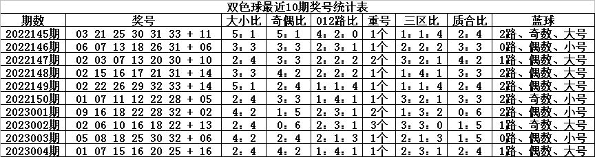 上期奇偶比为4:2,奇数活跃,近10期奇偶比为27:33,偶数开出比例较高,本期注意奇数反弹,关注奇偶比开出3:3。