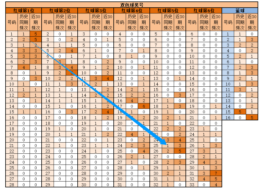 蓝球,历史同期频次最多的为2-5;近30期,频次最多的为16,明显特征是合数优势;推荐重点2-7-8-10-13-16。