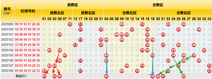 根据近十期质合数据统计:质数左区出现9次(持平),质数右区出现9次(下降),合数左区出现22次(持平),合数右区出现20次(上升),总体质数出现18次(下降),合数出现42次(上升),由于33个红球质数12个、合数21个,占比4:7, 根据近十次质合比重1:2来看, 从比重比例对比近十次数据发现,质数略低于合数,因此本期预计质数区上升。本期根据斜率遗漏对称理论,质数左区需注意防01 03 05,质数右区无;合数左区需注意防04 18,合数右区需注意防20 21 26。