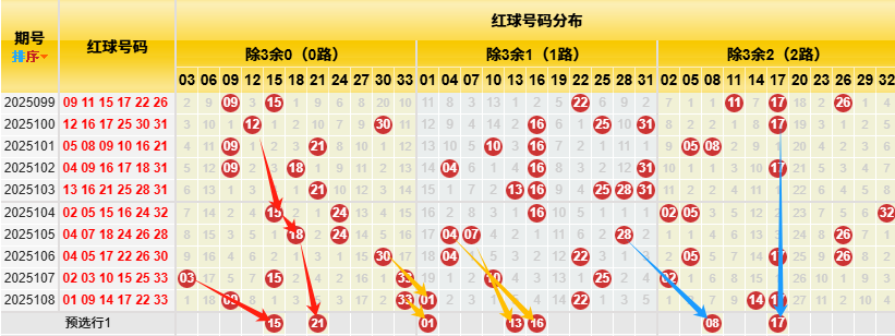 【数据参数】 根据前区除3余数,组合成上图分别为余0路(简称0路)3、6、9、12、15、18、21、24、27、30、33;余1路(简称1路)1、4、7、10、13、16、19、22、25、28、31; 余2路(简称2路)2、5、8、11、14、17、20、23、26、29、32。