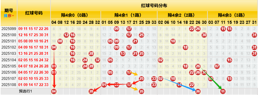 【数据参数】根据前区除4余数,组合成上图分别为余0路(简称0路)4、8、12、16、20、24、28、32);余1路(简称1路)1、5、9、13、17、21、25、29、33;余2路(简称2路)2、6、10、14、18、22、26、30;余3路(简称3路)3、7、11、15、19、23、27、31。