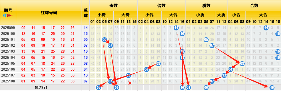 双色球第25108期开奖号码:01 09 14 17 22 33+07 ;其中前区三区比为2:3:1,奇偶比为4:2,和值96,总跨度为32